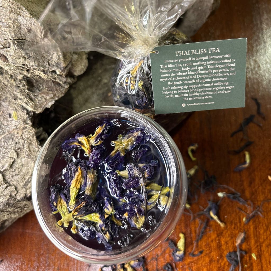 „Tajų Palaima” arbata išsiskiria ryškiai mėlyna spalva, kurią suteikia mėlynosios balnapupės žiedlapiai, giliu Red Dragon Blood arbatos skoniu ir šiluma dvelkiančiu ceilono cinamonu. Arbata yra visiškai be kofeino, todėl ją galima mėgautis tiek dieną, tiek vakare. Įspūdingas spalvos pokytis – nuo mėlynos iki violetinės – įvyksta įlašinus citrinos sulčių. Tai ne tik gėrimas, bet ir pojūčių kupinas ritualas, kuris suteikia ramybę, skatina sąmoningumą ir gerina savijautą.